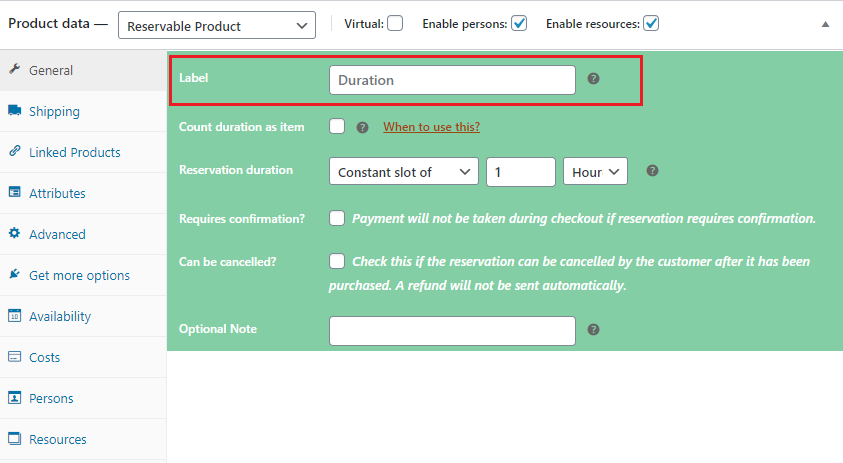 The default label is Duration. You can put there Ticket, Course etc as well. This is important to choose a correct label because this will be shown in Cart page, Checkout page and also in Email notifications. For example, if you put Duration and customer book for 2 days, the Cart page will show "Duration: 2 Days". If you put "Ticket", the Cart page will show "Ticket: 2" and so on..