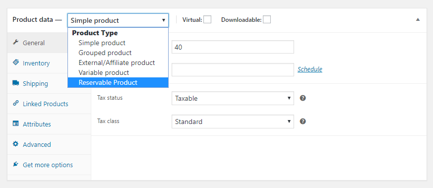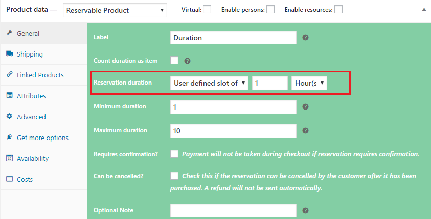 Booking fields will be available as soon as you choose Reservable Product. The booking fields will be under the following 5 tabs: