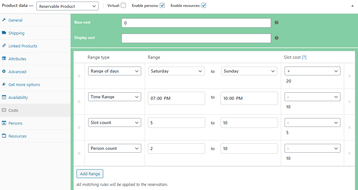 The Add Range button is an useful functionality of the Costs Tab. By this button, you can increase or decrease the price/cost for certain period of time OR for certain number of persons OR for certain number of slots.
