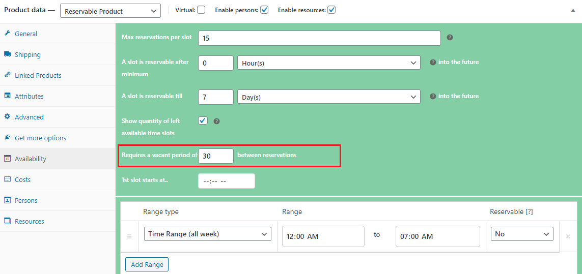 From the Availability settings tab you can set how many resources (a resource can be hotel rooms, tickets, seats of a course, rentable products etc) you have for booking, what is the minimum amount of slots the customer can book, what is the maximum amount of slots they can book etc. You can set certain period of date/time as Non-Reservable also.