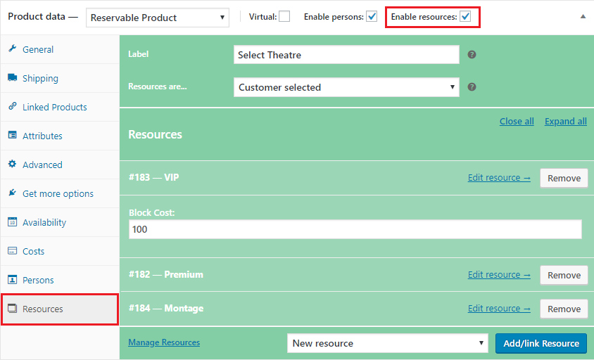 Resources in ARB plugin are those things which will be available in the booking for customers to choose from. A resource can be a Hotel room OR a Theatre OR a Color OR a Department OR Course Type OR a Car Type etc etc. You can add as many resources as you need. All the resources you add in a product will be available in the drop-down in the booking form in the front-end. Just give a Tick mark on Enable resources and you will have the Resource tab with all those settings.