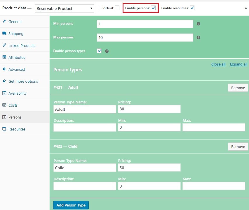 Put a Tick mark on Enable Persons and you will have a new tab as "Persons". In the person settings tab you can put minimum and maximum value and also you can input different person types. You can set different prices, different minimum and maximum value for different person types as well. The Person Types is a very useful option for your booking form. View the details of the Person Types Settings from here.