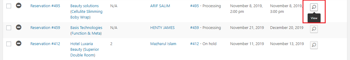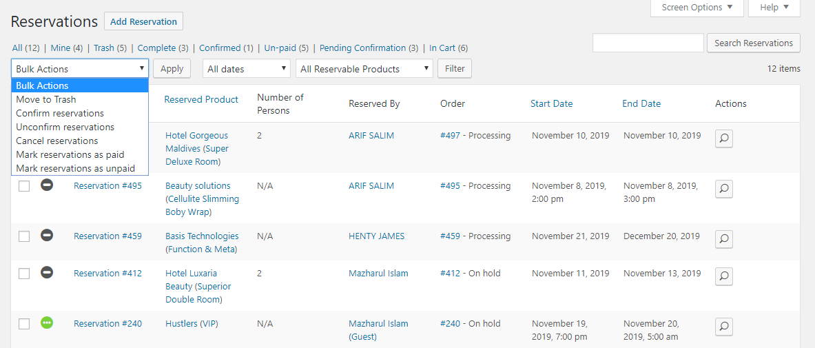 To view all the reservation orders, go to WP-Admin > Reservations > All Reservations page.