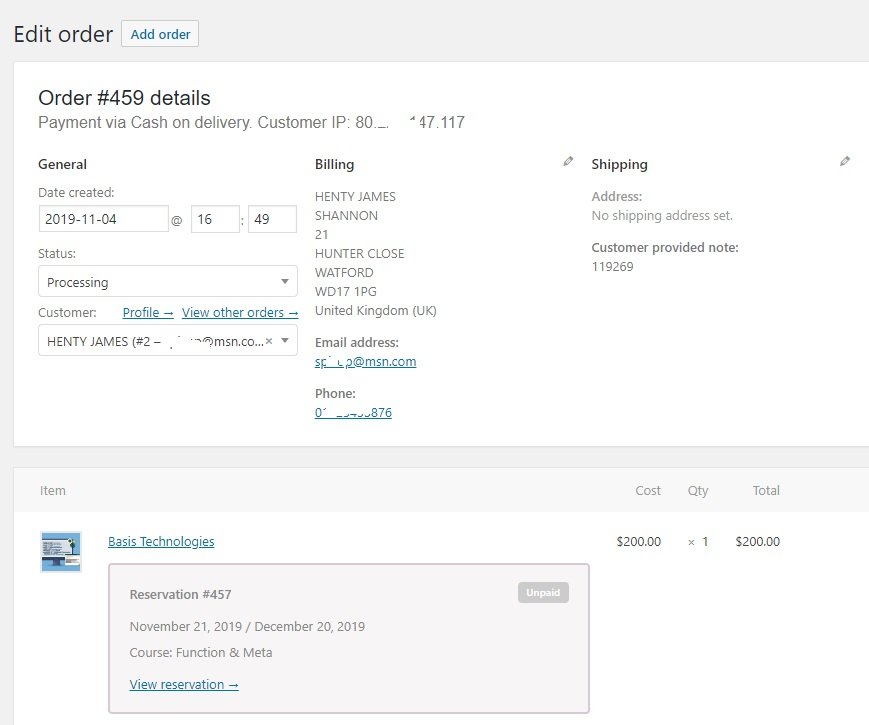 To view the details of a reservation order just click on the Search icon. You will have a new page where all the details of the order will be displayed. You can add private note with the order, email invoice to the customer, change the status of the order from there.