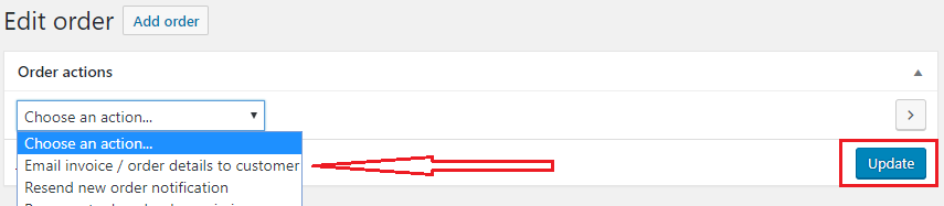 In the individual order page click on the Order Actions Dropdown and choose Email invoice / order details to customer and click on the Update button.
