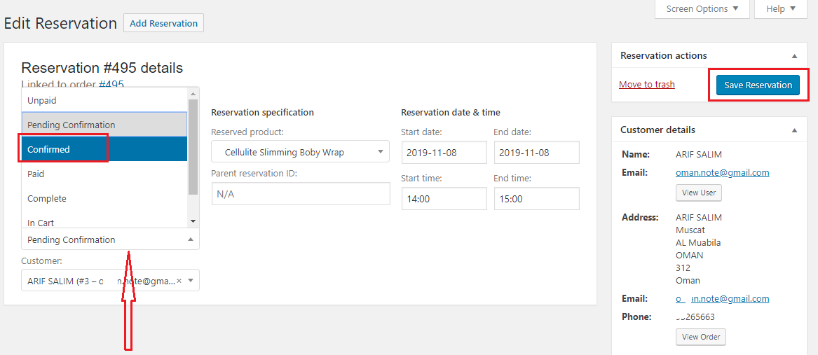 In the Edit Reservation page you will see a Status dropdown. Choose Confirmed from the dropdown and then click on the Save Reservation button