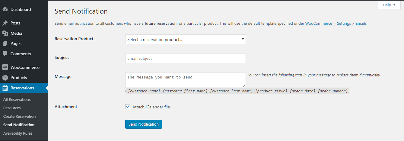 Visit WP-Admin > Reservations > Send Notification page and choose a product whose customers will get the email. Then put subject and message in the given fields and click on Send Notification button. There are some dynamic tags available which you can use in your email. For example: if you use {customer_name} in your email message, it will be dynamically converted to the real customer's name in the email.