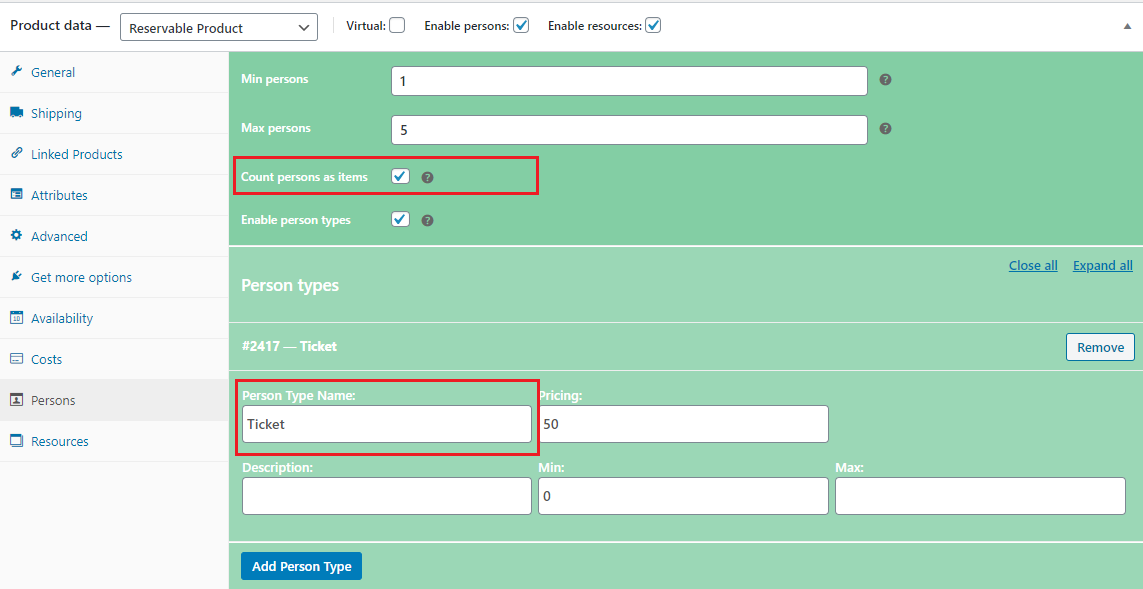 For example, if you sale movie tickets you will use the Person Type settings to set the price of the ticket, and to set minimum and maximum tickets a customer can purchase at once. If you need to add more fields in the booking form (like checkbox fields to choose Soft Drinks and Popcorn), you can do so by clicking on the Add Person Type button. You can add as many Person Types as you want by clicking on the Add Person Type button.