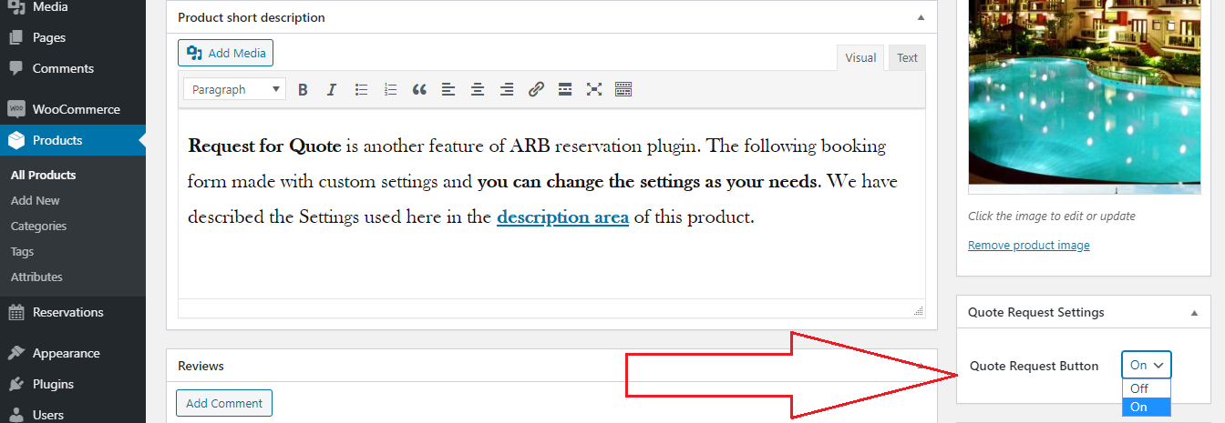 Then visit the products editor page for which you want the Quote Request button. At the right sidebar you will find the Quote Request Settings section. Choose On from the dropdown and then click on Update button of the product.